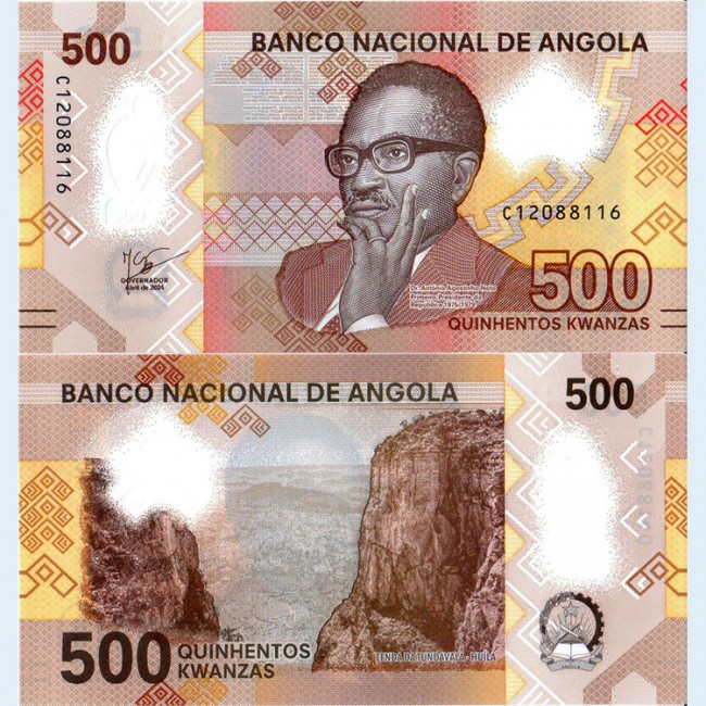 Купить ангольскую полимерную банкноту номиналом 500 кванза 2024 года выпуска, состояние UNC. На боне изображен ангольский политик Антонио Агостиньо Нето. С обратной стороны купюры - ущелье Тундавала (18 км от города Лубанго).