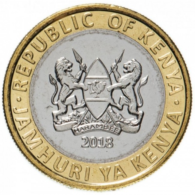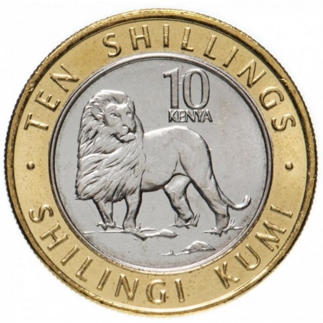 Купить кенийскую монету 2018 года выпуска номиналом 10 шиллингов с изображением льва.