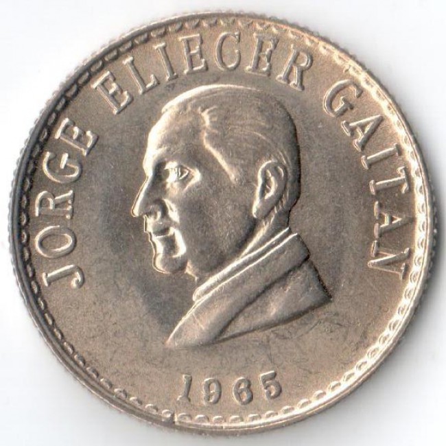 Купить колумбийскую монету 1965 года выпуска номиналом 20 сентаво Хорхе Эльесер Гайтан, номер по каталогу: KM# 224.