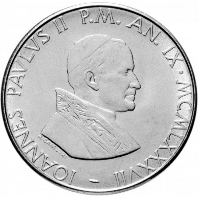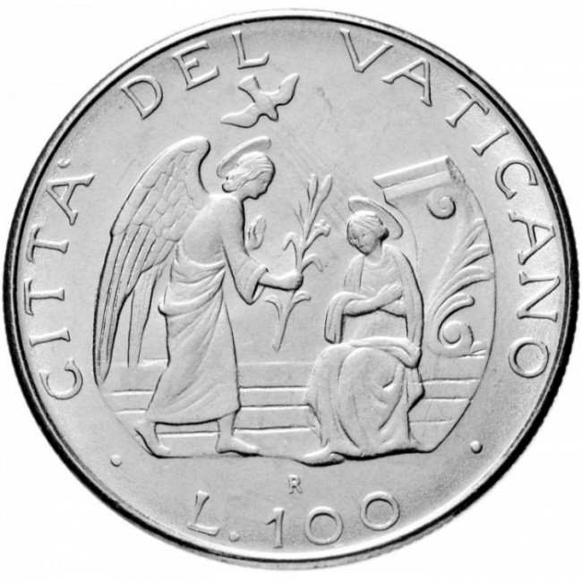 Купить Ватиканскую монету 1987 года выпуска номиналом 100 лир Благовещение (MCMLXXXVII Иоанн Павел II), номер по каталогу KM# 202.